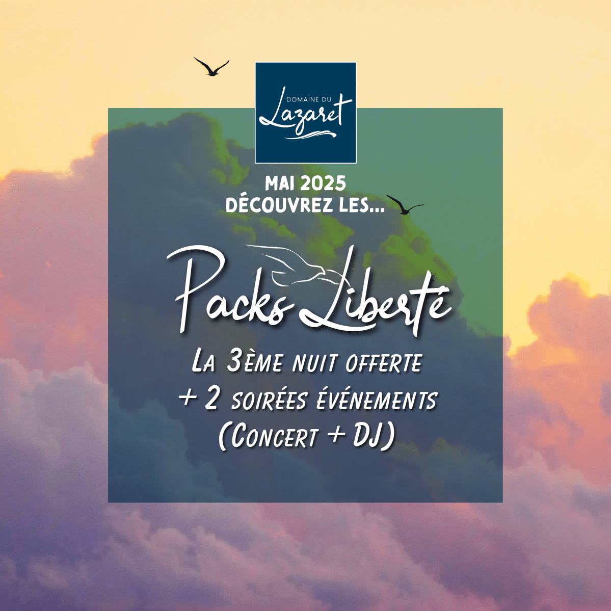 Faites le pont avec les « Packs liberté » du mois de mai : La 3ème nuit est offerte et vous profitez de nos 2 Soirées événements (Concert le vendredi, DJ le samedi) Le petit-déjeuner est compris Séjours d’au minimum 2 nuits (+1offerte) entre le 1er et le 5 mai, ou entre le 8 et