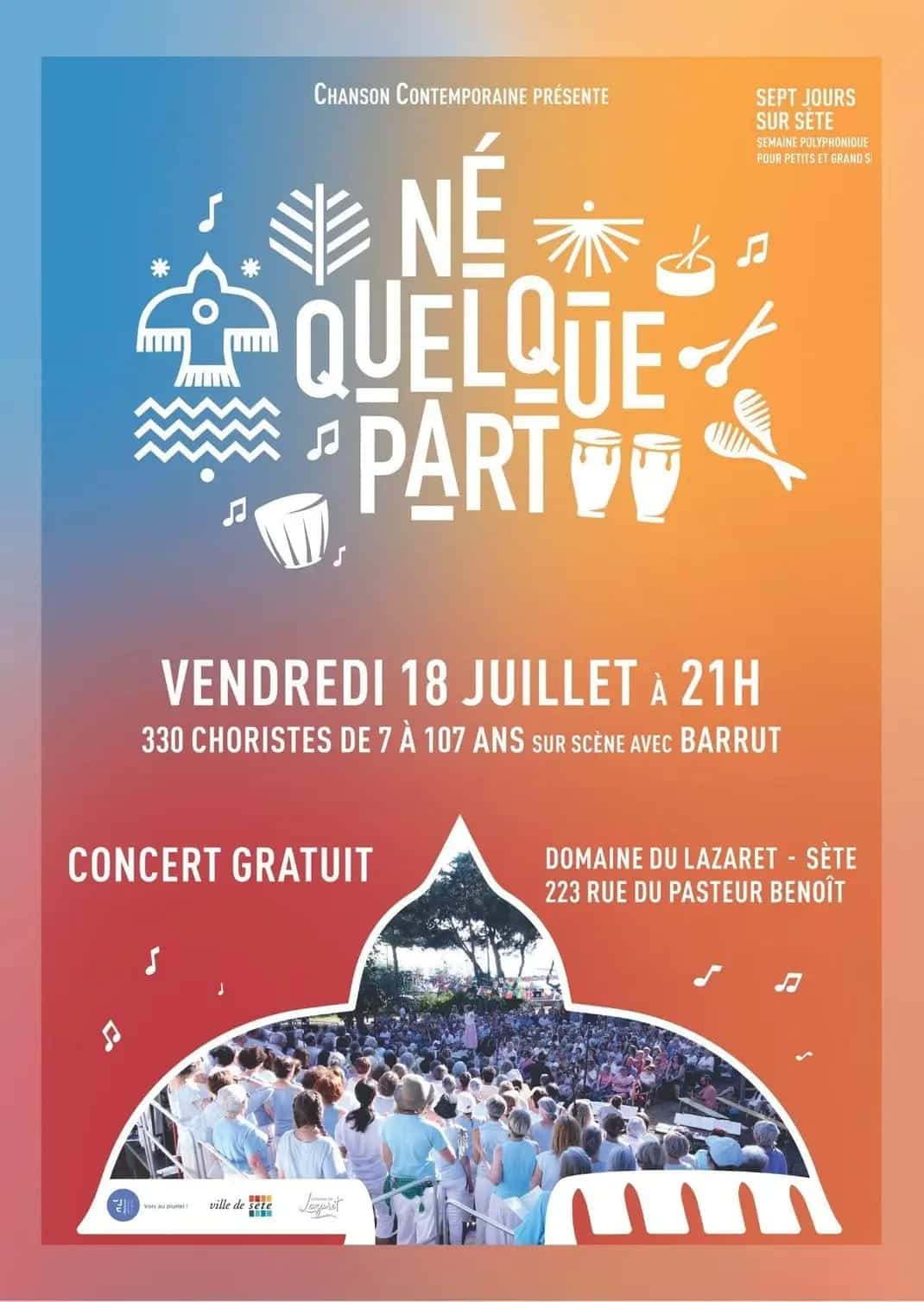 Únete a los 330 coristas del curso Sept jours sur Sète en un concierto excepcional en el Domaine du Lazaret. En su espectáculo «Né quelque part», encontrarás canciones donde el aquí y ahora se enriquece con el en otro lugar, donde lo que se escribe hoy se nutre de lo que se hizo ayer, de Georges Brassens a Gaël Faye, todo ello con el acompañamiento del grupo Barrut. Un concierto único, culminación de un curso de una semana que reunió a más de 300 coristas de toda Francia, de 7 a 107 años.