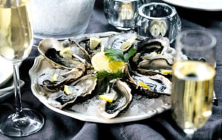 Austern, Tielles, Muscheltaschen, Muschel-Brasucade, Tapenade, Sonnengemüse, Ventre bleu (Muscat pétillant), Muscat doux, Picpoul de Pinet…