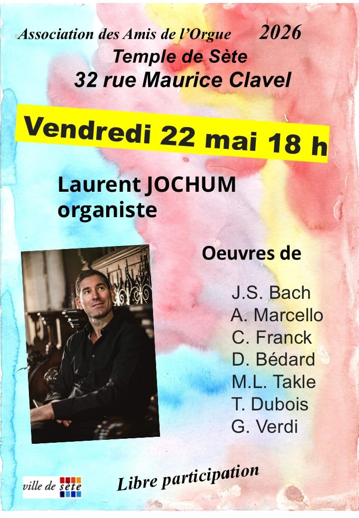 L’organiste concertiste Laurent Jochum, titulaire des grandes orgues de l’église Saint-Jean-Baptiste de Belleville à Paris, propose un récital mêlant grandes œuvres du répertoire et pièces contemporaines. Au programme notamment Johann Sebastian Bach, César Franck ou encore Giuseppe Verdi. Informations pratiquesOrganisateur : Association des Amis de l'Orgue de l'Eglise Protestante Unie de Sète et Bassin de